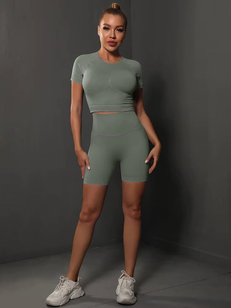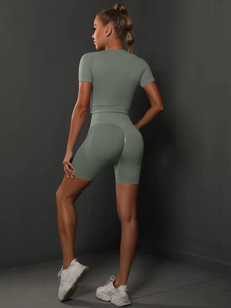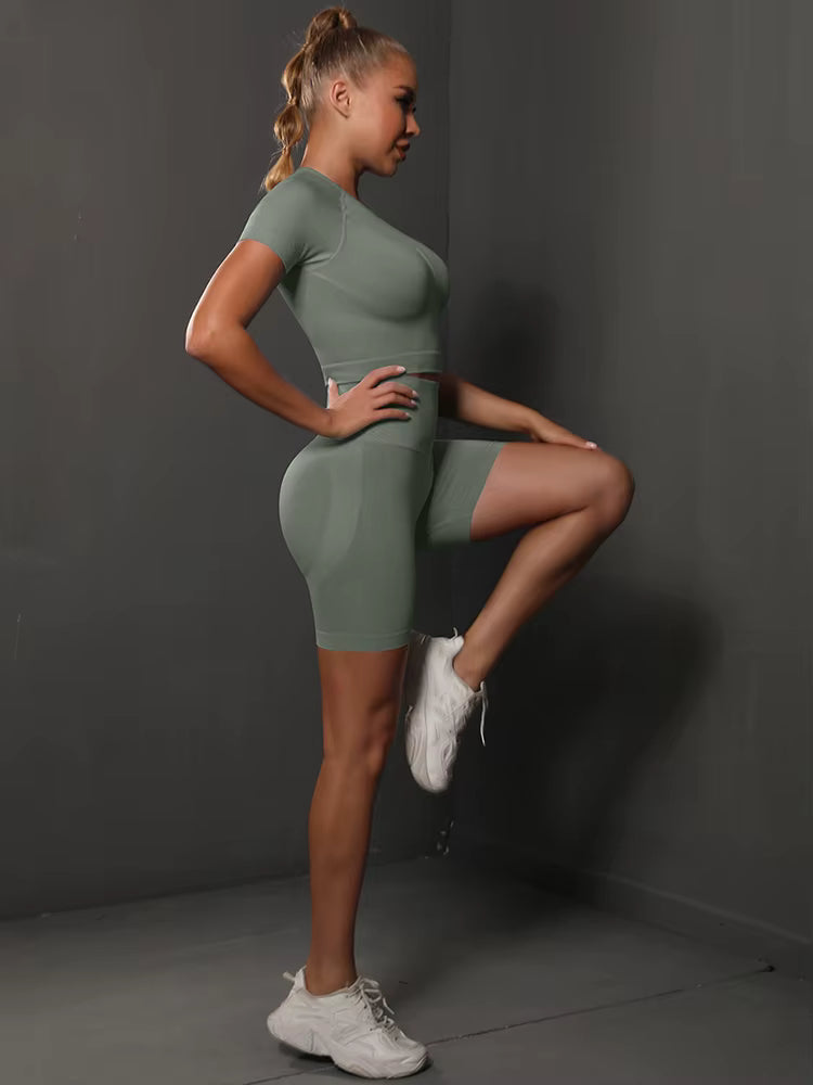 Introducing our 2-Piece Seamless Women’s Yoga Set, designed for women who demand both elegance and power in every movement. This sophisticated gym ensemble features a sculpting seamless top paired with high-waisted, body-contouring shorts that enhance your natural curves with a subtle butt-lifting effect.