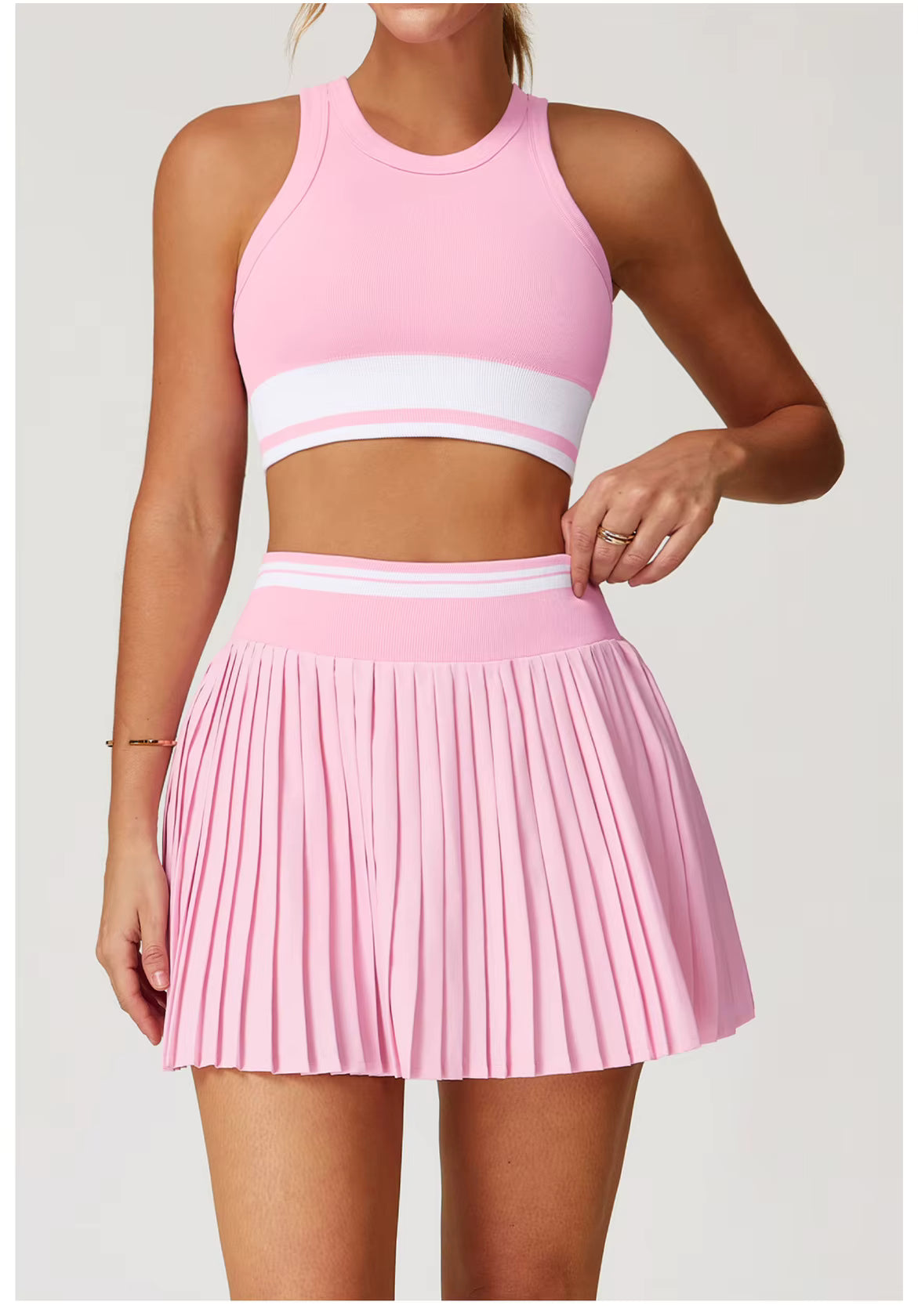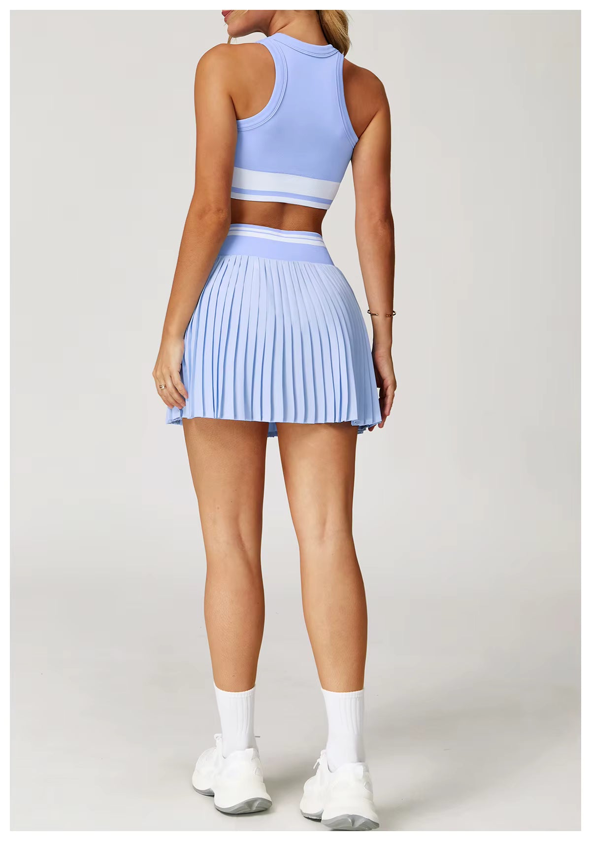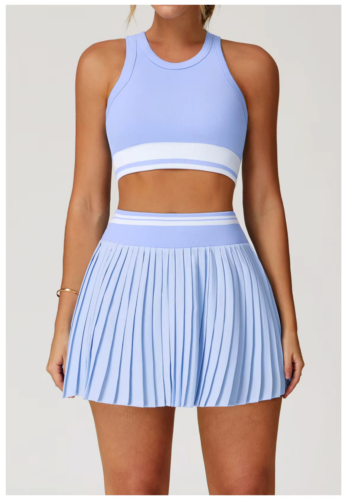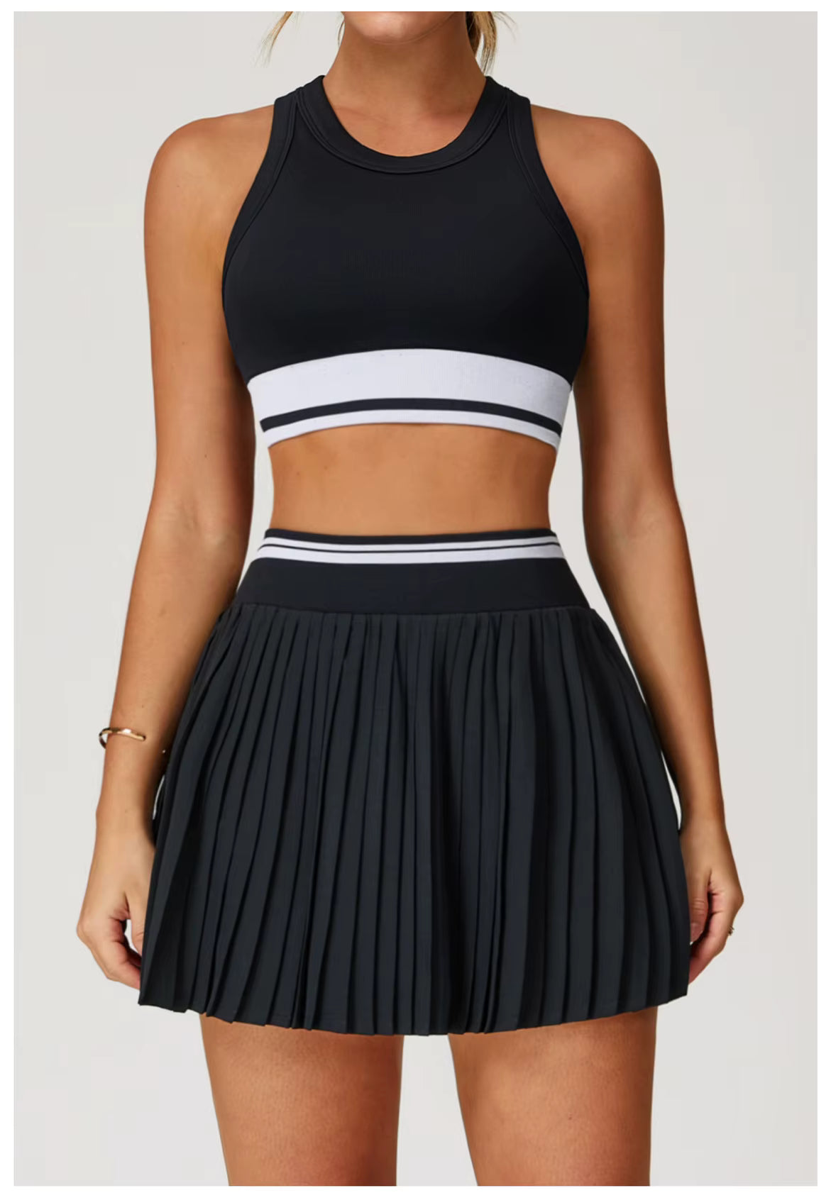 The high-rise waistband offers gentle tummy support and a secure fit, while the tailored short skirt delivers freedom of movement with a feminine edge. Made from breathable, moisture-wicking fabric, this set keeps you cool and dry whether you're powering through gym workouts, flowing through yoga sessions, or styling it for elevated athleisure looks.