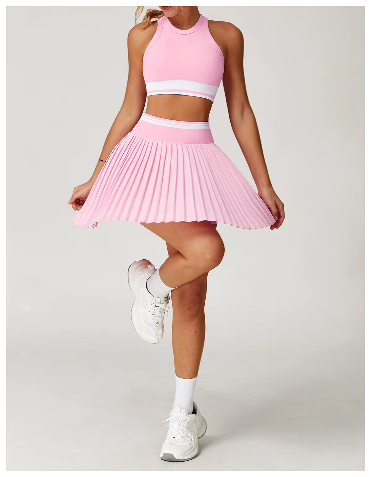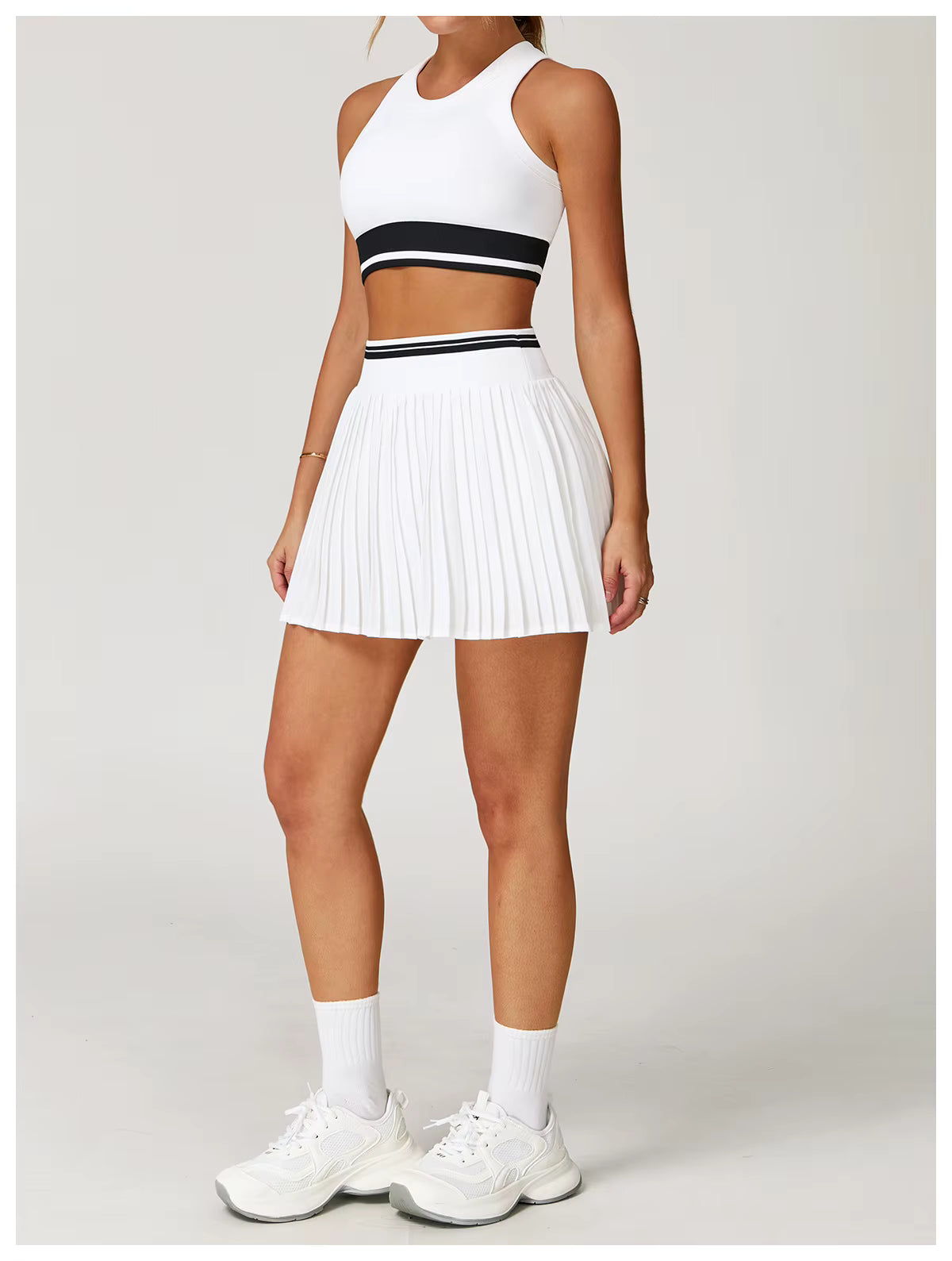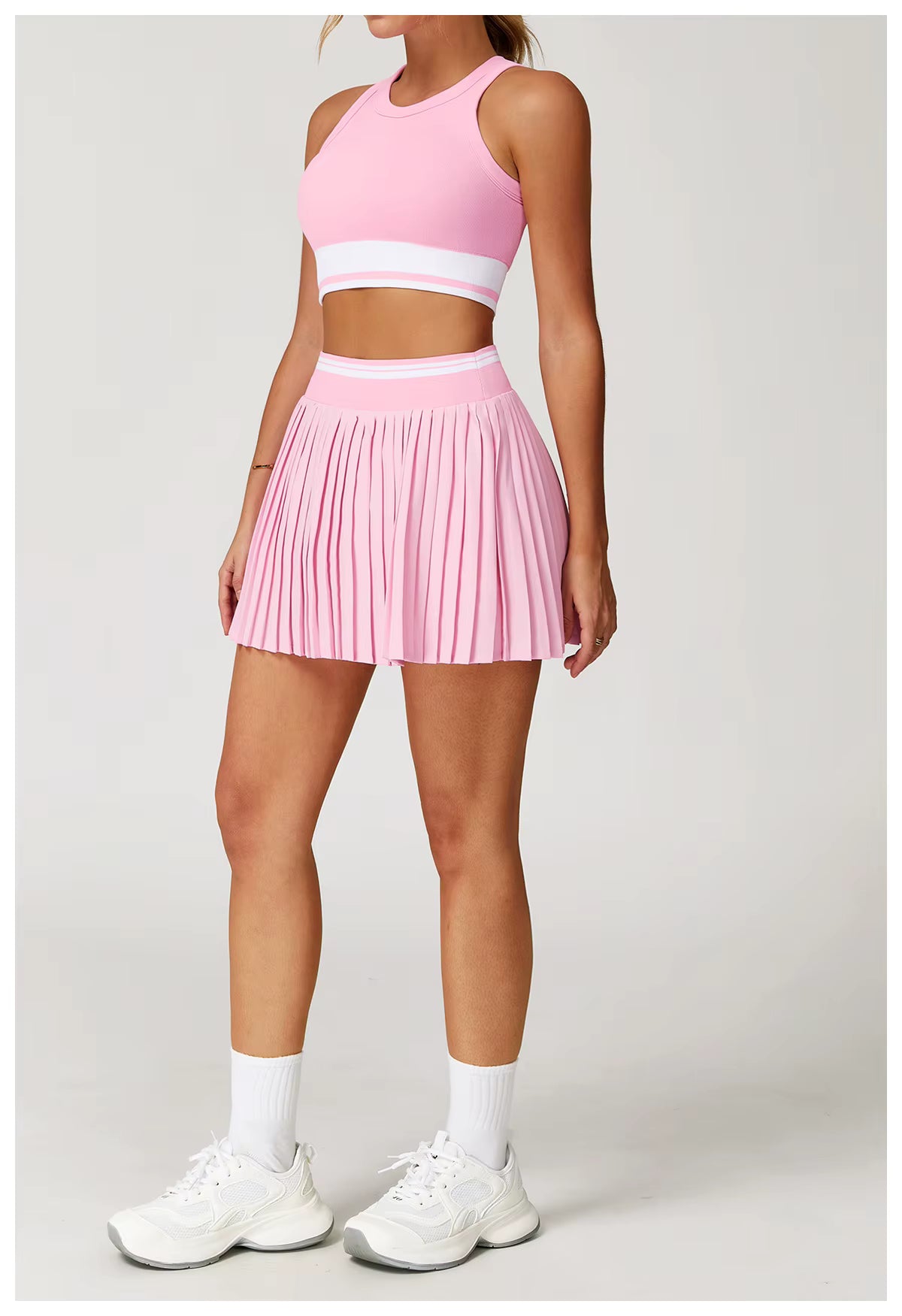Designed to sculpt and flatter, this refined set features a sleek fitness vest paired with a high-waist short yoga skirt, crafted in a striking color-block design that enhances your silhouette with modern sophistication. The seamless construction ensures a smooth, second-skin feel, eliminating distractions while maximizing comfort and confidence.